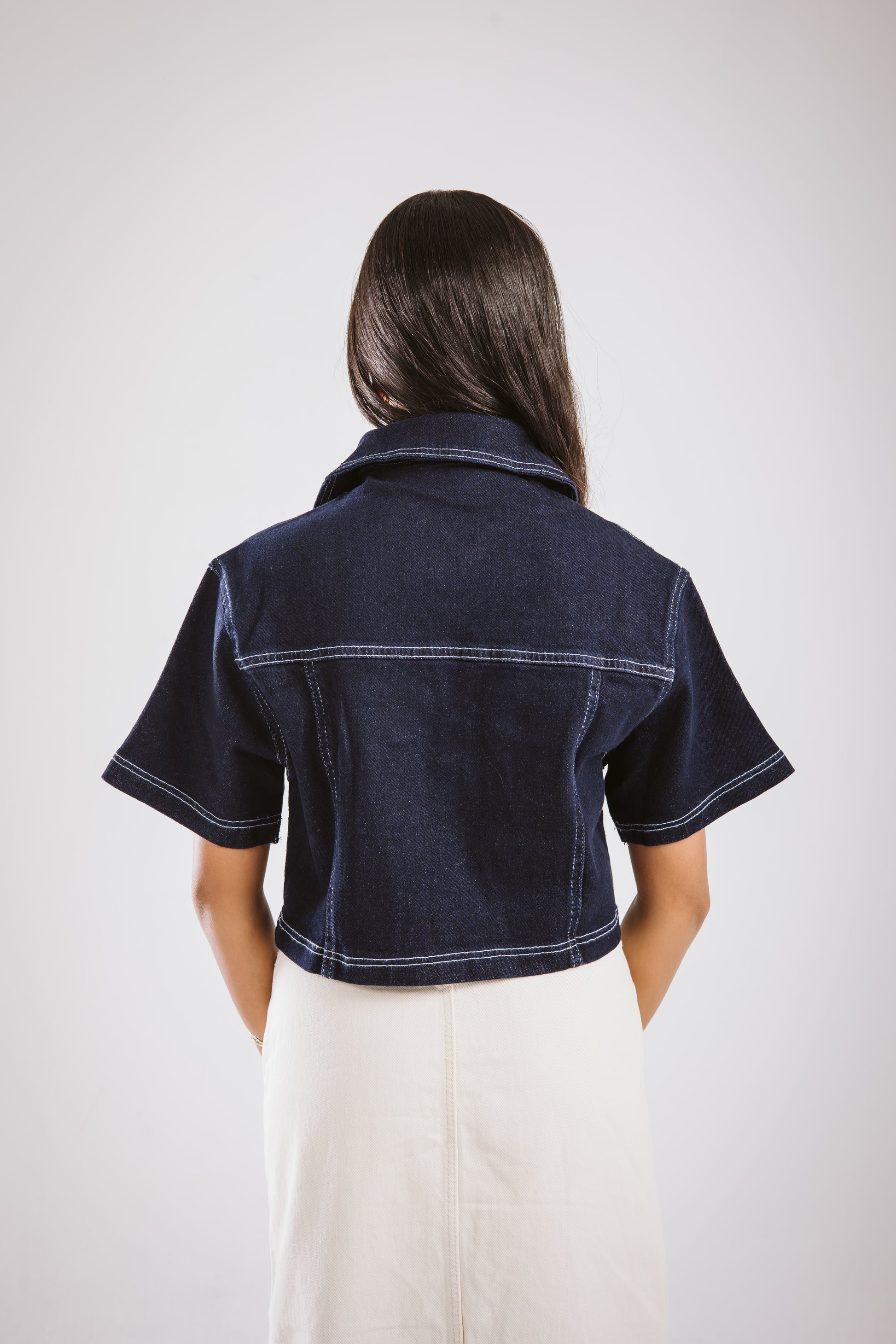 Designed for comfort and style, our dimensional denim top features a unique lycra denim fabric that provides a soft and stretchy fit yet sturdy. The cropped, relaxed design allows for effortless movement and a flattering silhouette. Upgrade your wardrobe with this versatile and trendy top.